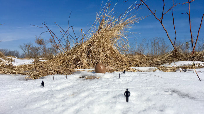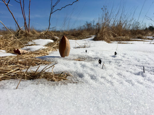 Intervención en terreno nevado con semillas de mamey, mango, aguacate y figuras humanas.